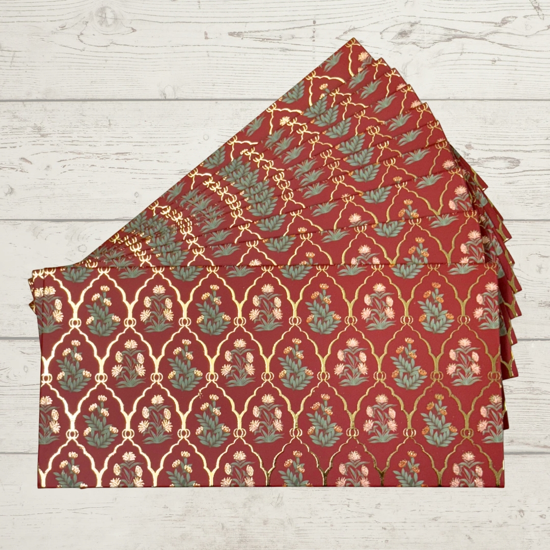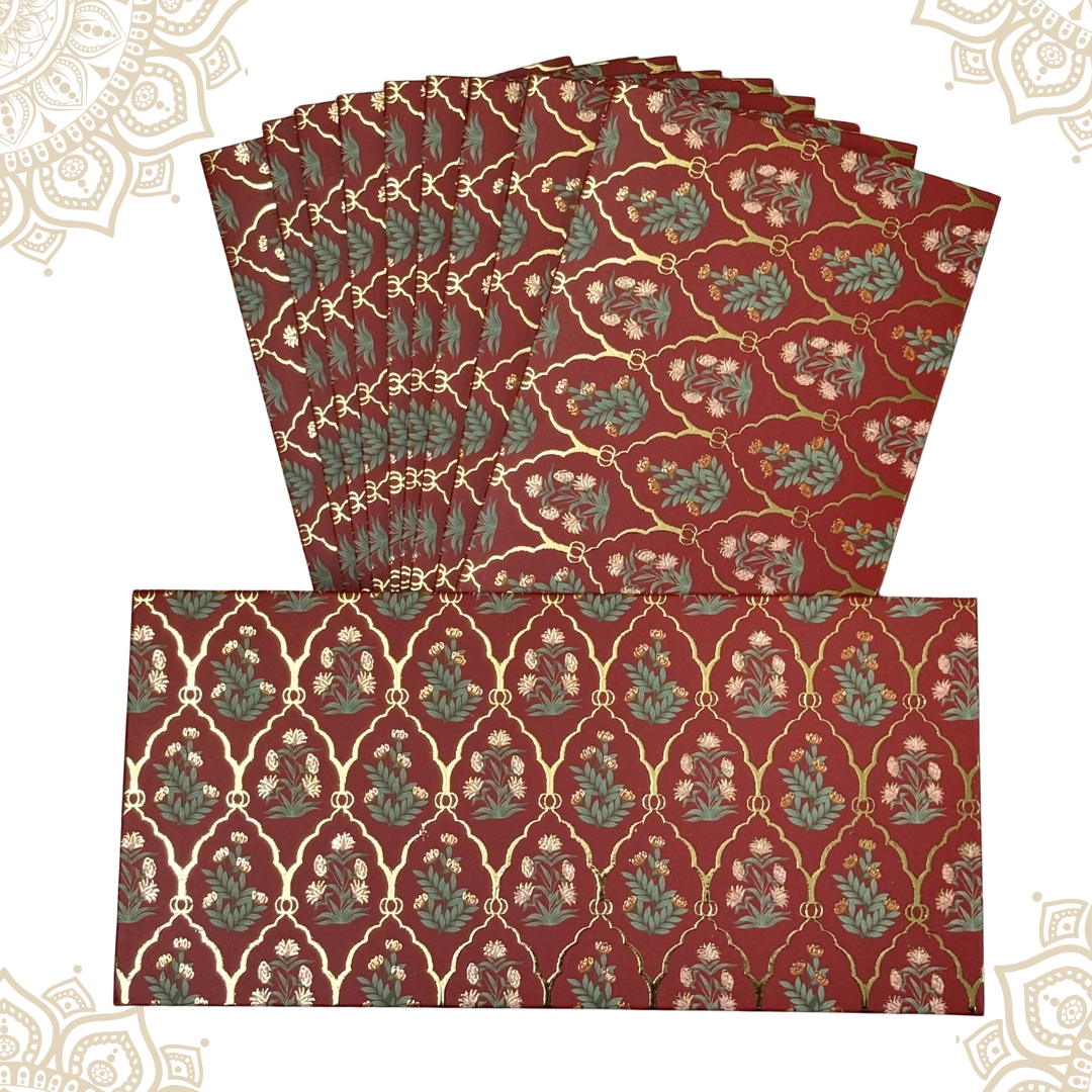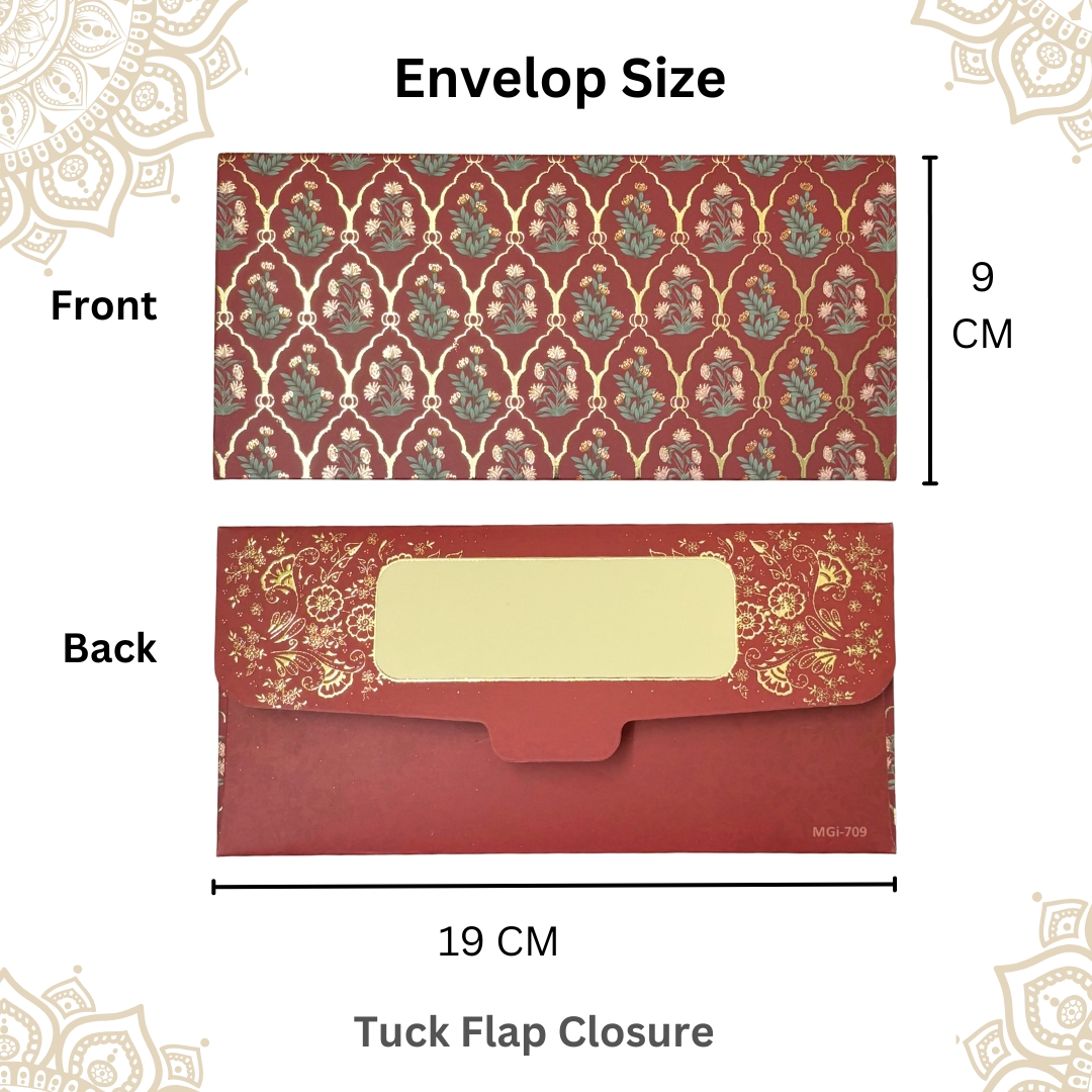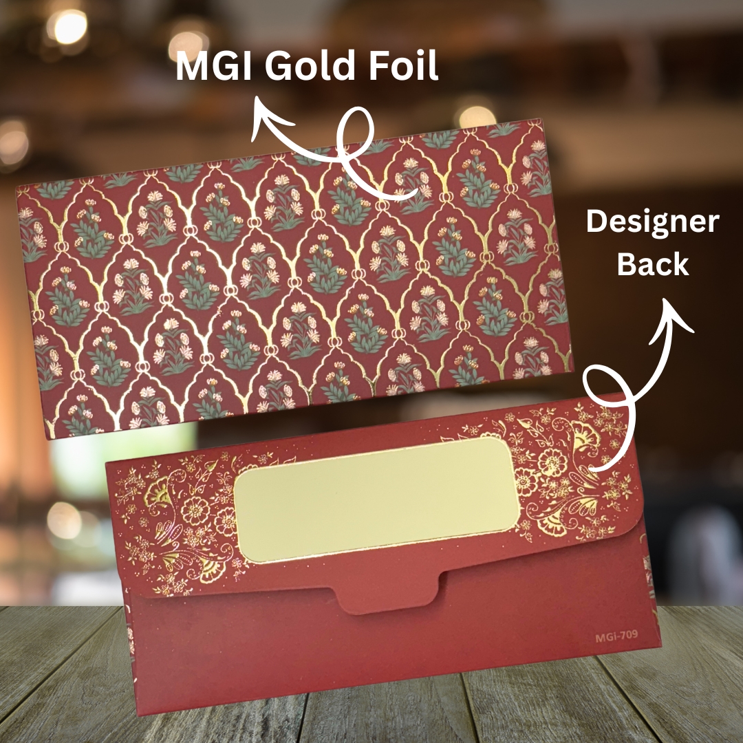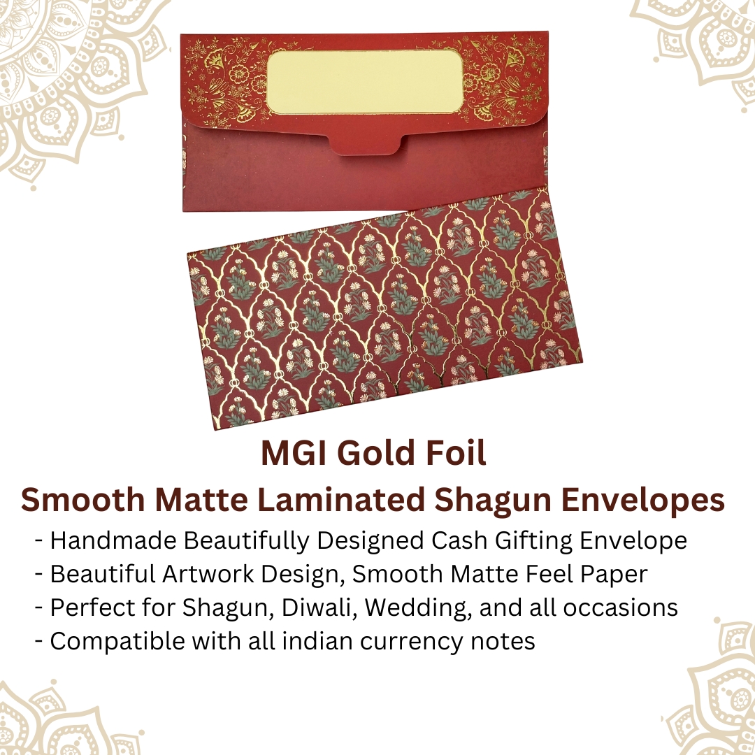 Experience the epitome of elegance with our Premium Quality Smooth Matte Finish Wine Red colored Embossed Gold Foil MGI Shagun Envelopes. Crafted to perfection, these envelopes boast a luxurious Matte finish, offering a touch of sophistication to your special occasions. Elevate your gifting experience with these exquisite Embossed Gold Foil MGI envelopes, designed to make every moment unforgettable.